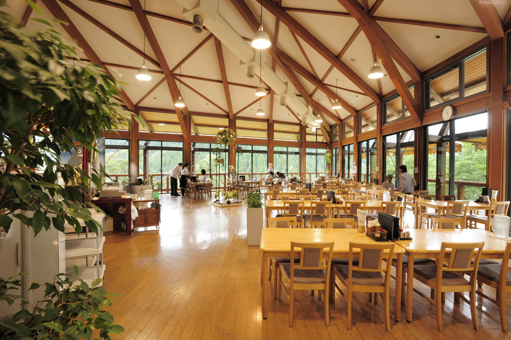 道の駅宇目内の「レストハウス うめりあ」は、ウッディな外観が周囲の緑と調和した水辺...